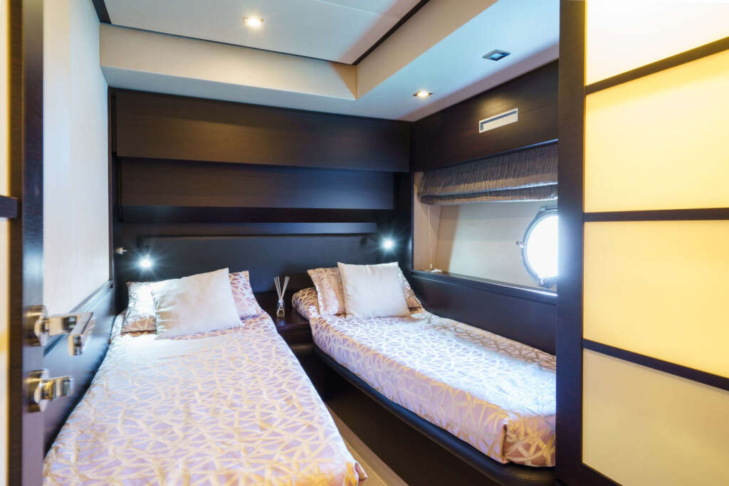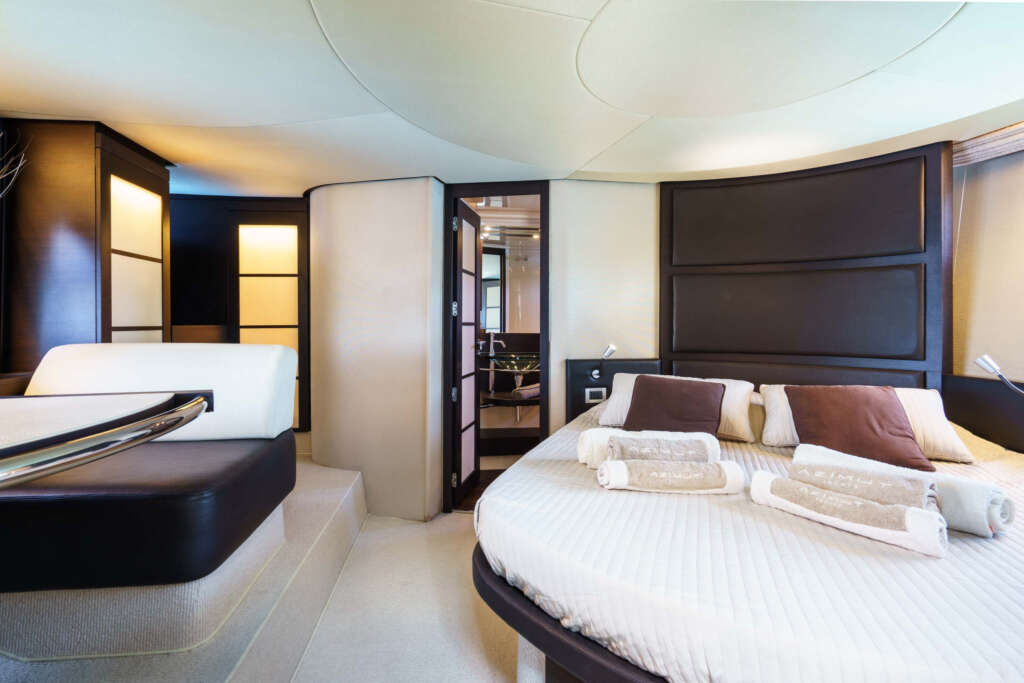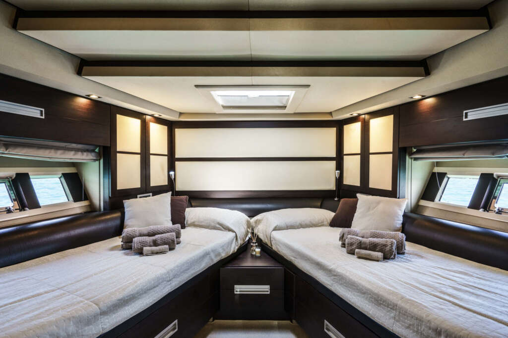 The Azimut 62S offers refined overnight accommodation for up to 4 guests, spread across two beautifully designed cabins that combine comfort, elegance, and privacy.