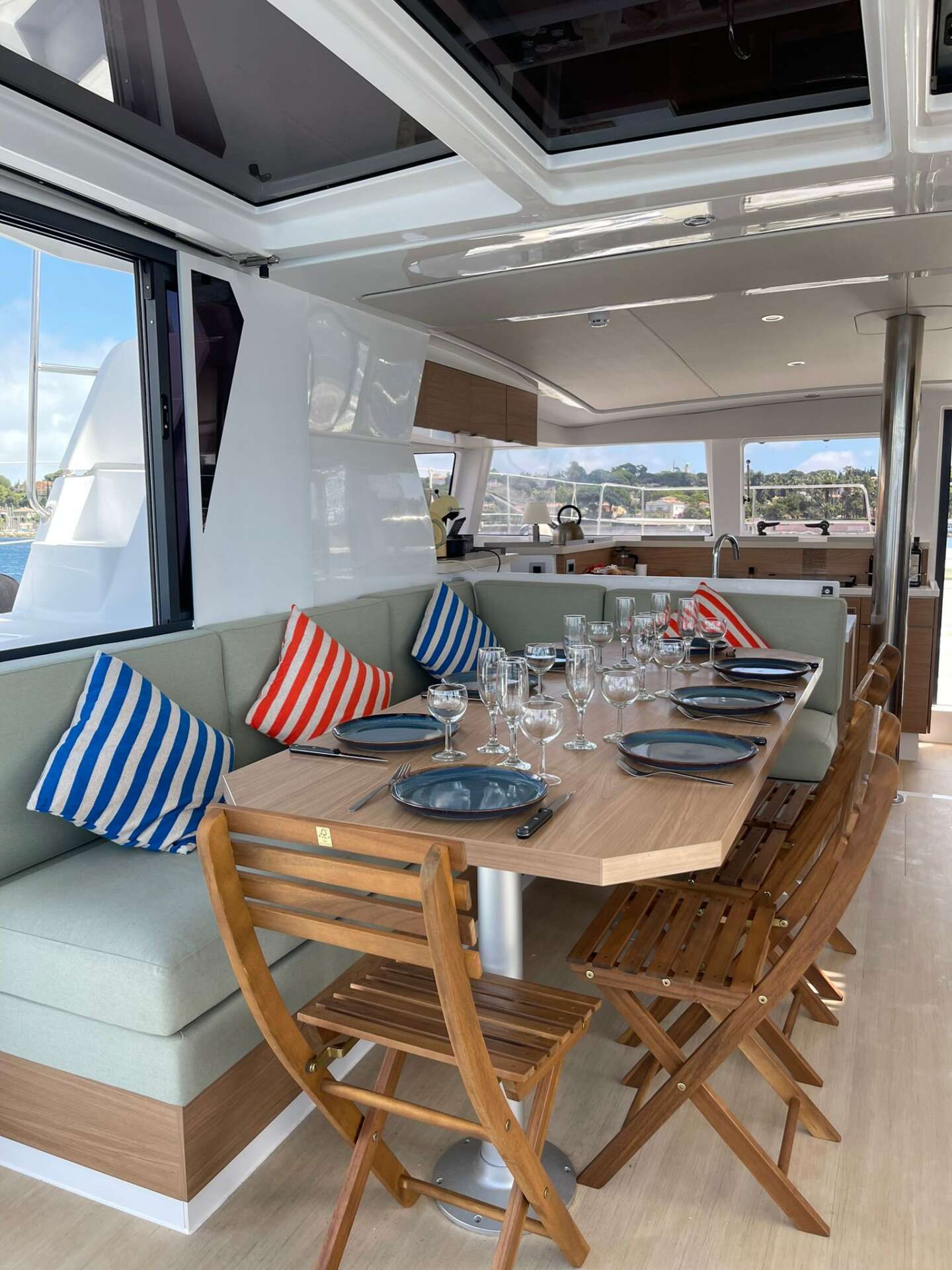 Rigid Front Cockpit: No more nets. Enjoy a vast forward lounge with sunbeds, directly accessible from the galley through an interior door.