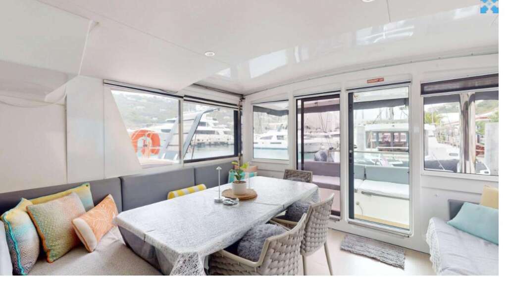 At the bow of the catamaran, the forward cockpit provides a shaded relaxation space with a table and sunbeds. It’s perfect for enjoying breakfast with a sea breeze or lounging in complete privacy while anchored in calm Caribbean bays.