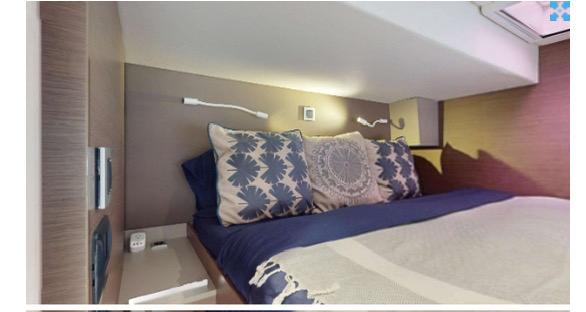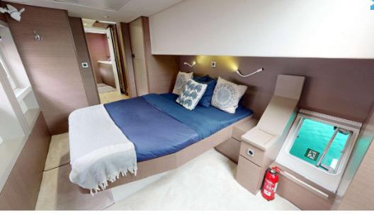 The central saloon is a key highlight of the Bali 4.8. Featuring 360° panoramic windows, the lounge is bathed in light and offers unbeatable views of the ocean. This open-plan space includes a plush seating area, dining table, and direct access to both the forward and aft outdoor areas, creating a unique flow between indoor and outdoor living.