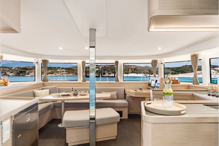 Inside, the bright contemporary interior is bathed in natural light thanks to large panoramic windows. The catamaran features four spacious double cabins, each with its own ensuite bathroom, offering privacy and comfort for all guests. Thoughtful layouts, elegant finishes, and generous storage transform this yacht into a true floating home.