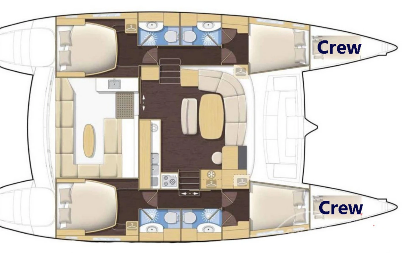 The Lagoon 450 F offers four spacious double cabins, each located in the hulls for maximum privacy and quiet. Every cabin features a full-size double bed, generous storage space, natural light through large portholes, and direct access to its own private en-suite bathroom with shower, toilet, and washbasin.