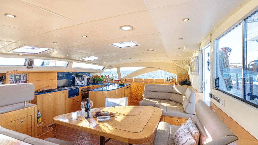 She accommodates up to 6 guests in 3 spacious en-suite cabins, including a Queen Master cabin and two versatile double cabins that can also be configured as singles. Each cabin features a private bathroom, desk/vanity area, generous storage, and excellent natural light—creating a true home-away-from-home atmosphere.