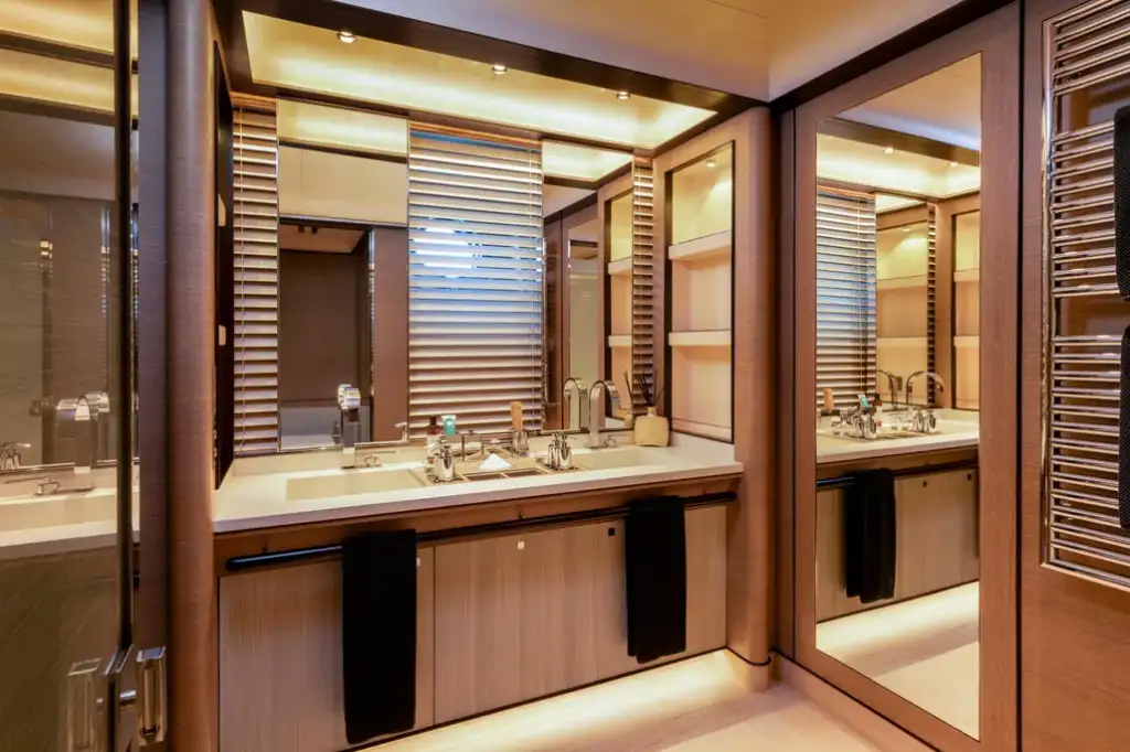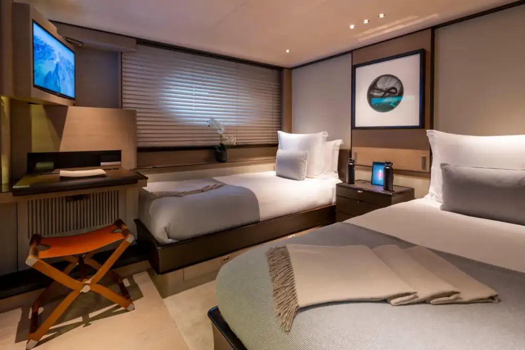 ASASHI welcomes up to 12 guests in six refined cabins, all designed to offer privacy and comfort. The full-beam master suite features a vanity, sofa, expansive wardrobe, and a luxurious en-suite with bathtub and shower. Additional accommodation includes two VIP cabins, two twin cabins with Pullman berths, and a flexible bunk cabin—ideal for children or staff. A professional crew of up to 10 delivers impeccable service throughout the charter.