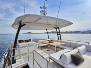 Accommodation includes three beautifully designed double cabins, each with en-suite bathrooms, providing privacy and comfort for guests. The master suite, located on the main deck, boasts exceptional space and breathtaking sea views, while the guest cabins offer a premium stay with high-end furnishings and natural light. For outdoor living, the Prestige M48 features a spacious flybridge, perfect for sunbathing, dining, or simply enjoying the Mediterranean breeze. The hydraulic swim platform makes accessing the crystal-clear waters effortless, while additional amenities such as a sound system, sun loungers, and water toys enhance the overall experience.