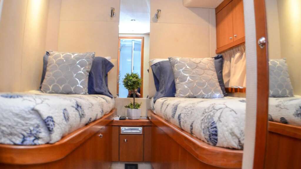 Below deck, you’ll find three elegant cabins accommodating up to six guests: a Master suite, a VIP stateroom, and a Guest cabin, each beautifully appointed, with ensuite bathrooms in the Master and VIP.