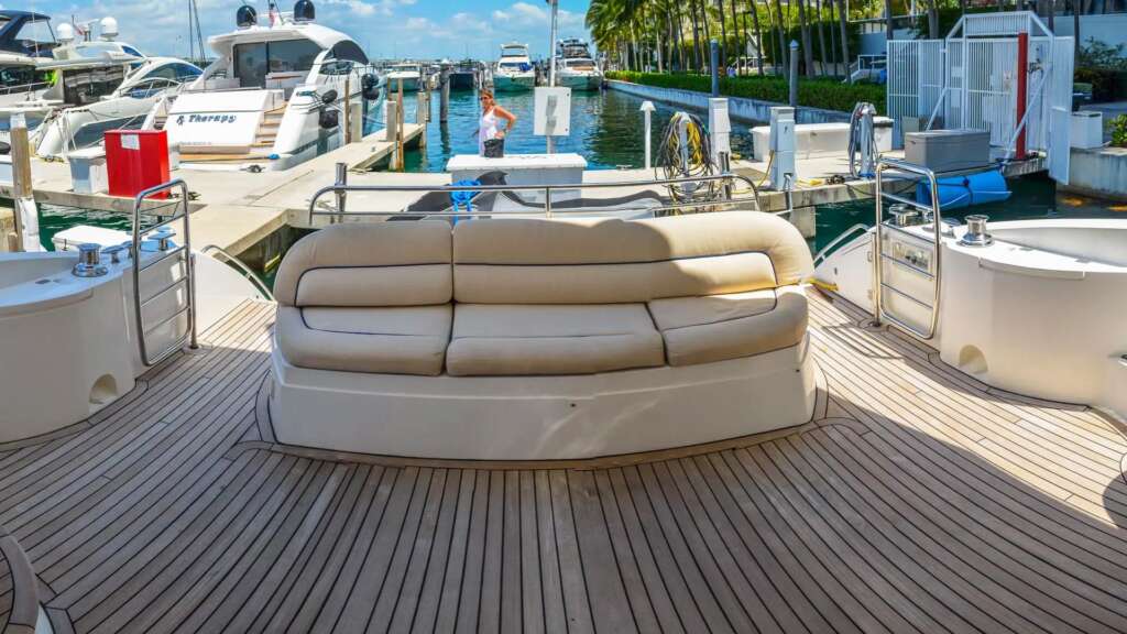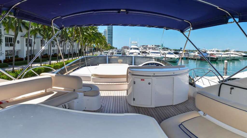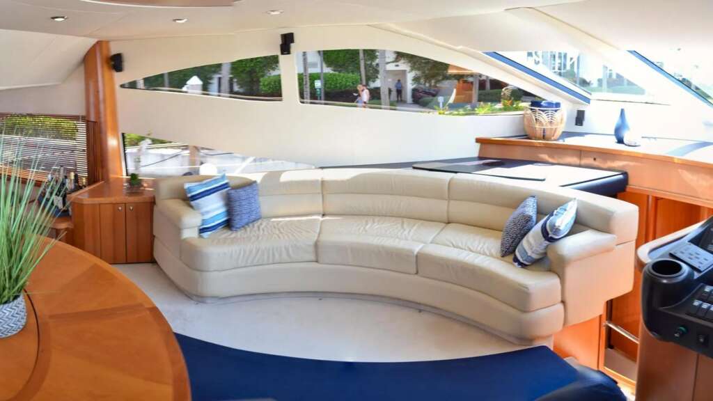 The expansive flybridge offers a perfect setting to unwind, sunbathe, or dine al fresco while taking in panoramic views of the Atlantic Ocean and Intracoastal waterways. The forward bow lounge provides an additional space for sunbathing and relaxation.