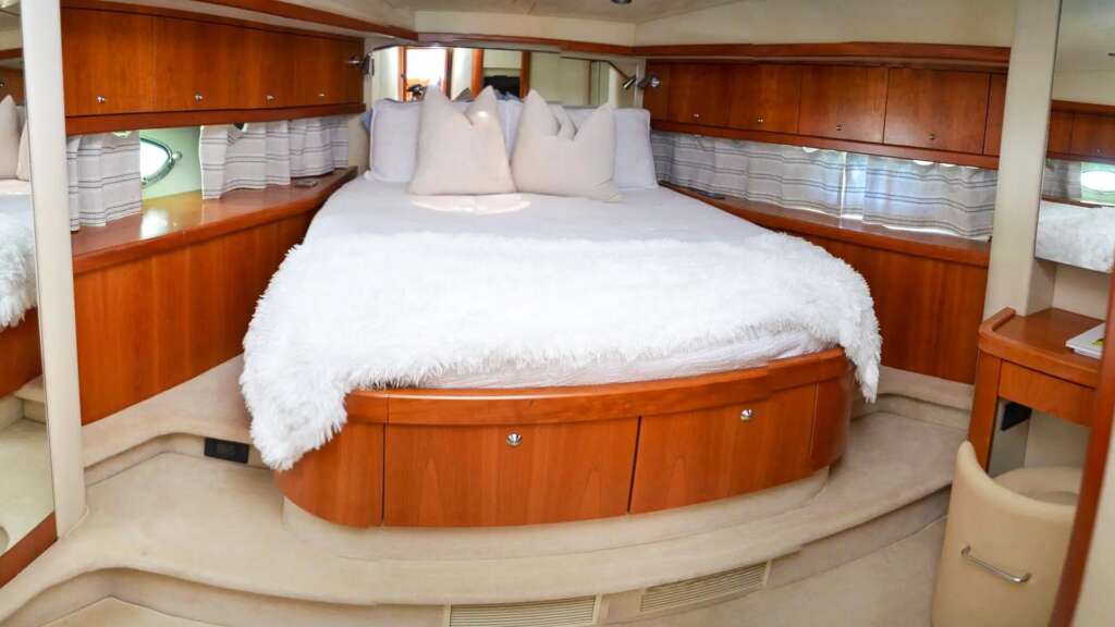 Below deck, you’ll find three elegant cabins accommodating up to six guests: a Master suite, a VIP stateroom, and a Guest cabin, each beautifully appointed, with ensuite bathrooms in the Master and VIP.