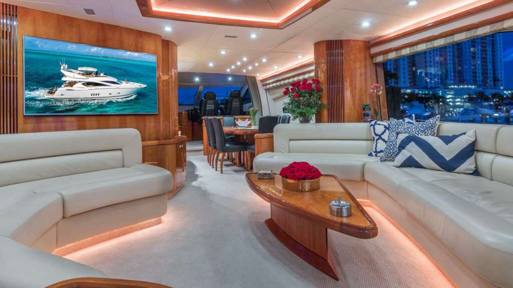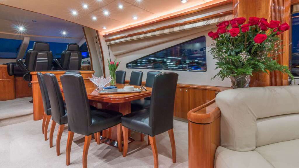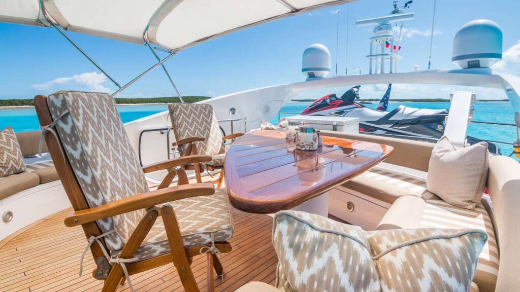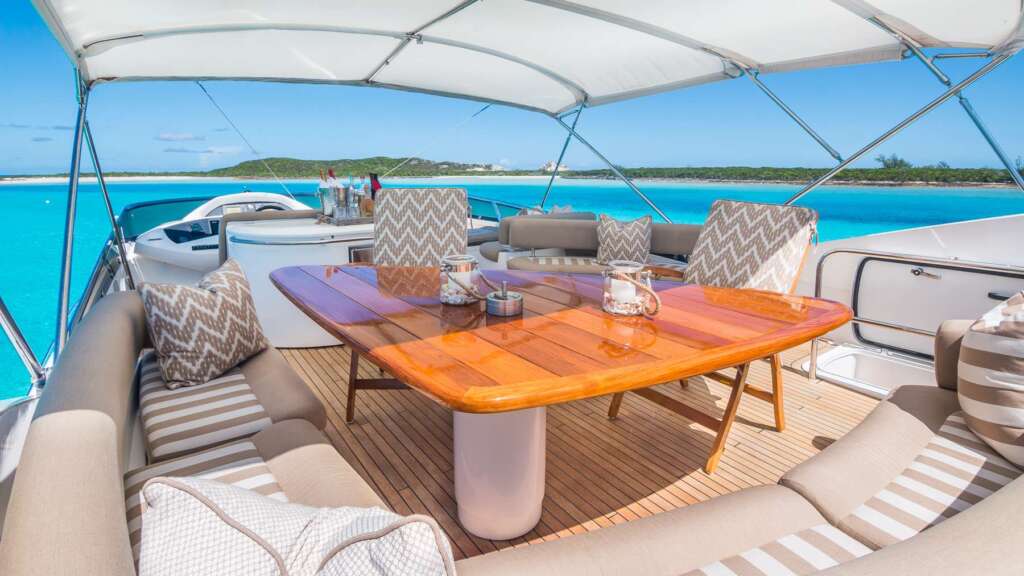 The yacht features spacious social areas for entertaining or relaxing. The aft deck flows into a bright main salon, ideal for gatherings or enjoying panoramic views.