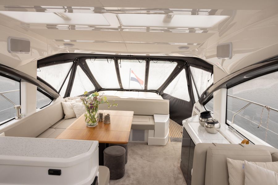 - Equipped with twin Volvo Penta engines, the Squadron 53 delivers impressive speed, smooth handling, and exceptional fuel efficiency, making it ideal for both short coastal cruises and long-distance voyages.